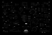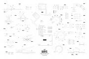 Sur une plaque de verre de 120 x 180cm sont sérigraphiés l'ensemble des dessins techniques de Melik Ohanian pour la réalisations du film DAYS, I See What I Saw And What I Will See. Considérée par l'artiste comme la partition ou le blueprint de l'oeuvre, nous découvrons les dessins préparatoires pour la construction des rails du travelling, les études pour la prise de vue et pour la production des outils, ainsi que le dessin de la trajectoire complète accompagnée des observations métriques et temporelles du lieu de tournage.