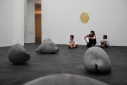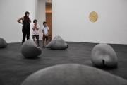 Shell (2014) - Monnaie d’échange millénaire venue de Chine, le cauri est devenu le premier moyen de payement, par l’intermédiaire des échanges commerciaux, des anciennes civilisations d’Afrique. Mais les cauris sont également utilisés lors de rituels divinatoires. Entre valeur économique et augurale, les cauris sont ici reproduits en béton et disposés selon le lancé des curateurs de l’exposition, comme autant de possibilités de lire le monde.