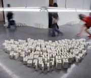 The artist dismantled phrases said by philosophers, sociologists and other figures above within his philosophical horizon, creating heaps of letters in the form of hand-made plaster casts... The white letters measured 16 cm in height and were placed in tidy piles: the ‘A’s together, the ‘B’s together, and so on. Through these, Melik Ohanian evoked a pre-linguistic stage of language. Each heap corresponded to the retranscription of the soundtrack extract of a figure’s voice, but here the letters forming this retranscription were piled up on the floor in disorder. Estrangement. Only a plaque bearing the name of the person quoted was present above the line of neon lights above the heaps, informing us of the paternity of the quotation. A few words emerged from this sea of letters, because the visitors were allowed to move the plaster letters around to re-introduce some meaning. Although the quotations were set out in Le Plateau like a series of archipelagos reduced to pure morphology, to their simple three-dimensional form, the fact remains that these were linked to another archipelago (the 15 joint exhibitions) and to the website, which in some way restored a territory to the whole in a movement of deterritorialisation/ reterritorialisation reminiscent of Deleuze. The “reading” of the heaps of letters was thus influenced — in advance or retroactively — by the meaning conveyed through the Internet.