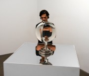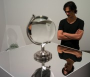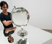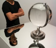 Un globe de verre de 33cm, monté sur un pied en métal. Fixé en deux points sur un axe incliné, il rappelle les globes terrestres utilisés depuis la fin du XVème siècle par les géographes. Présenté au centre d’un socle cubique surmonté d’un miroir, celui-ci existe en deux versions : Planet, dont le verre fabriqué industriellement est homogène ; et Cosmos, dont le verre fabriqué artisanalement est criblé de bulles d’air. L’artiste voit dans la première l’image de notre planète, tandis que se lit dans la seconde un univers, un macrocosme dans un microcosme.
