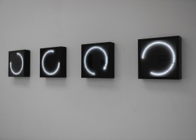 Seconds going by draw a circle on four modified digital clocks (Figure of Interval, 2014). The circular figure produced by the materialization of the 60 seconds elapsed is staggered by 15 seconds from one clock to the other. Thus the synchronized pace allows the viewer to see and experience perpetually this figure of interval.