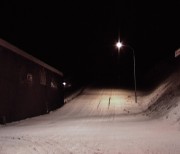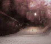 Nuit mi noire, mi blanche. À gauche, on devine des constructions. Au bout de la route, une lumière - la dernière. Film « immobile » et muet, Nightsnow met l’image à l’épreuve de la durée. La boucle, qui scelle le retour du même, l’enserre dans un temps cyclique, une léthargie qui n’est pas étrangère à la neige. 5 minutes 1 secondes, indéfiniment répétées, où le temps s’étire dans l’observation. Théâtrale, l’image nous immerge dans une atmosphère feutrée, une permanence qui appartient au monde naturel et non humain. L’échelle de la projection, invite le spectateur à s’y plonger - à l’instar d’estampes ou de paysages romantiques, qui conduisent le regard du proche vers le lointain.