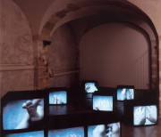 Then he talks. He tells how he wanted to film the hands of workers on strike, at a factory in France; and then it was too complicated, and it couldn’t be done. There was not much time left, it was just before the trip to Armenia, before the summer exhibition. He left. And it was there that things happened. Over there there was this place, the basement of a cinema, a sort of labour exchange, not even illegal, over there that is how things are, from another age, those men waiting to be chosen , hours, days, to be given a job. For a dollar they follow you. It was weird, he said, we ended up in a friend’s appartment; there were nine men, and he asked if they could tap in their hands, just once, if he could film them at a particular moment. They must have said yes. Then he returned, edited the images, sampled the sounds, made this soundtrack with a musician friend, these three loops, just as you see looped on screen the few filmed seconds of those hands resting and clasped, beating hands – which have done so much work, which derive their identity from that, but this time are doing something else.