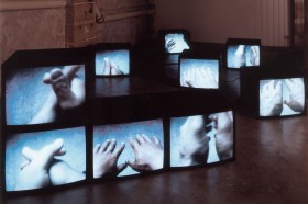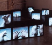 Who do these hands belong to? On the screen there is no way of recognizing them. We look at them: hands of men, hands of men who have lived and above all worked; hands dangling, which are joined, stretch out or clasp, and clap – once. There are nine screens on the ground, as many times two hands which clap, as many men whose hands we cannot see. We see them, then, not right away, we hear them – but what do we hear? More than a sound, a beat, the rhythm of sounds edited in sequences, extremely simple music, as live and spare as this image of hands alone on a dark blue even ground.
