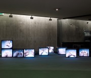 Ces mains, à qui sont-elles ? Rien ne permet à l’écran de les reconnaître. On les observe : des mains d’hommes, des mains d’hommes qui ont vécu, et surtout travaillé ; des mains ballantes, qui se rejoignent, s’étendent ou se serrent, et claquent – une fois. Il y a neuf écrans à terre, autant de fois deux mains qui claquent, autant d’hommes dont on ne voit que les mains. On les voit puis, ce n’est pas tout de suite, on les entend – mais qu’entend-t-on ? Plus qu’un son, une pulsation, le rythme de sons montés en séquences, une musique extrêmement simple, aussi vive, dépouillée que cette image de mains seules sur fond bleu sombre, uni.