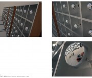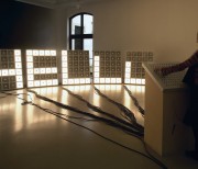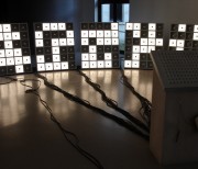 Slowmotion, From Slave to Valse is an installation with five light panels hooked up to a control console by electric cables. The artist invites visitors to use outdated computer equipment to produce letters, words, and symbols on the panels set up in the space. The visitor is then invited to write down the numbers of the buttons they used in a notebook, creating a numerical code that becomes a practical memory of the exhibited work.