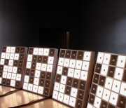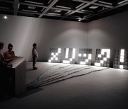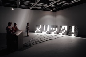 Ce dispositif, qui déploie une méthode de code archaïque, constitue selon l’expression de l’artiste un « ordinateur préhistorique ». Il en possède les éléments de base - code, signal électrique, transcription arithmétique - et fonctionne par analogie avec le système binaire sur l’alternance de deux états : allumé ou éteint. En codant puis numérisant le message qu’il compose, le visiteur agit lui-même comme un processeur - et semble avoir pénétré un circuit simplifié, agrandi, et ralenti, où les cases carrées séparant les ampoules font figure de pixels hypertrophiés.